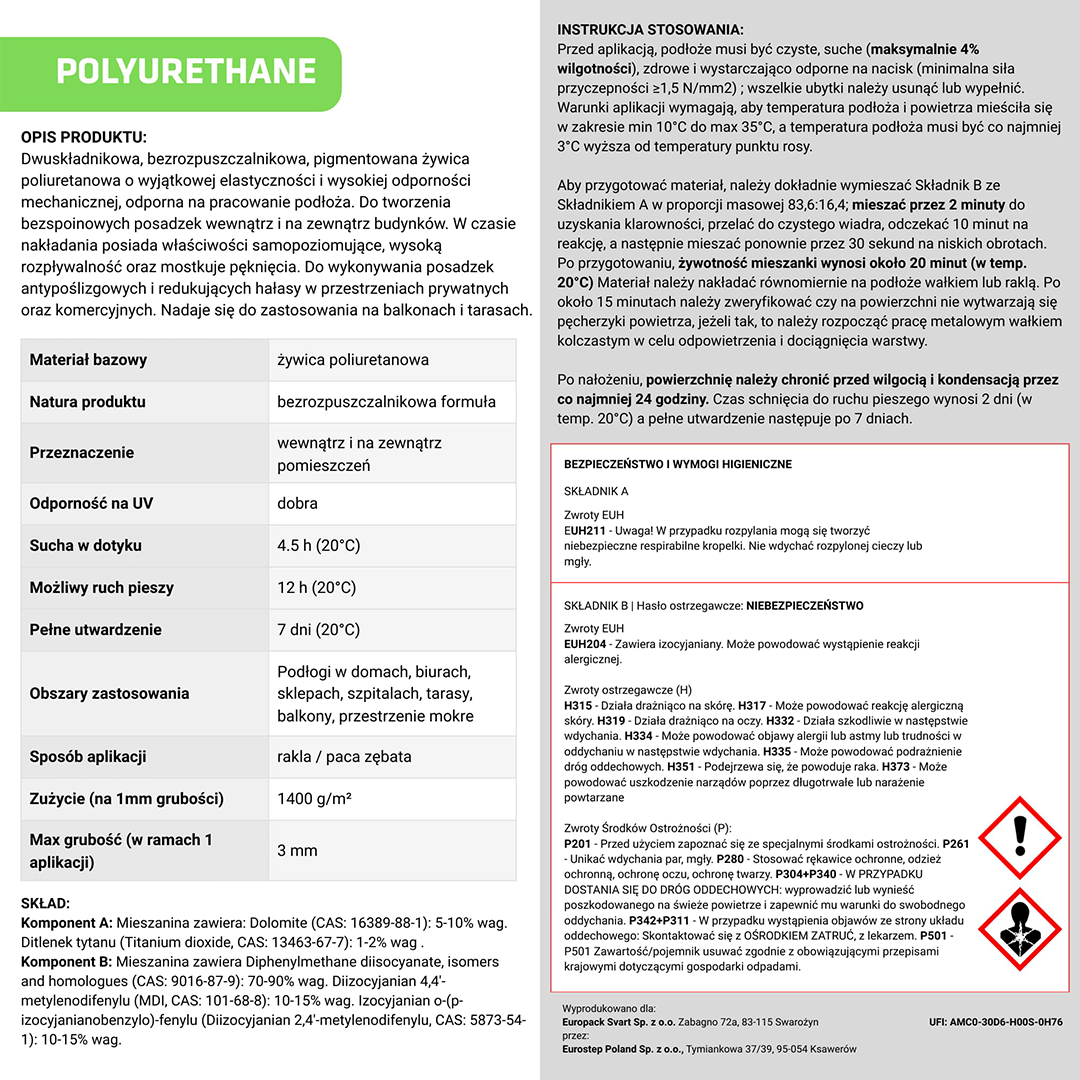 Dwukomponentowa, bezrozpuszczalnikowa żywica poliuretanowa charakteryzująca się bardzo wysoką elastycznością oraz odpornością mechaniczną. Produkt sprawdzi się do tworzenia bezspoinowych posadzek zarówno wewnątrz, jak również na zewnątrz budynków.